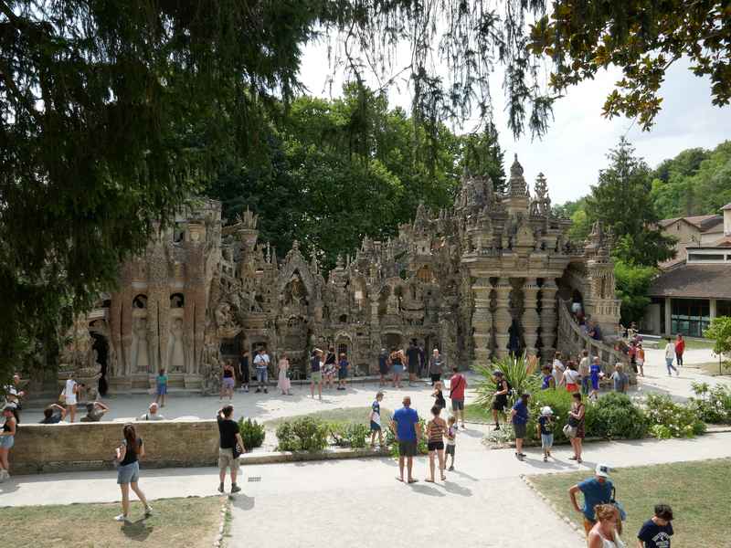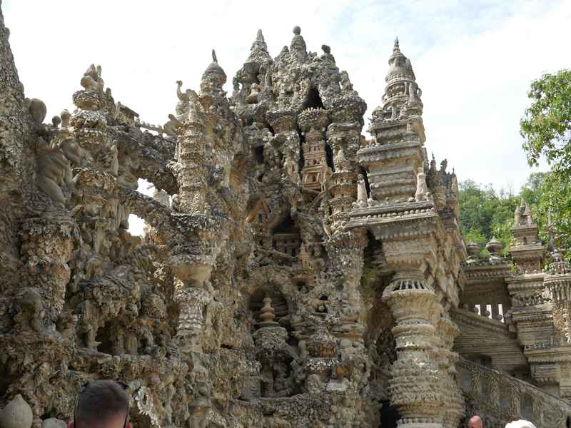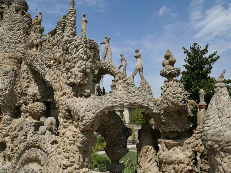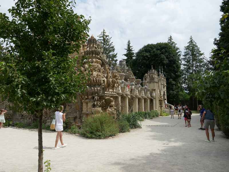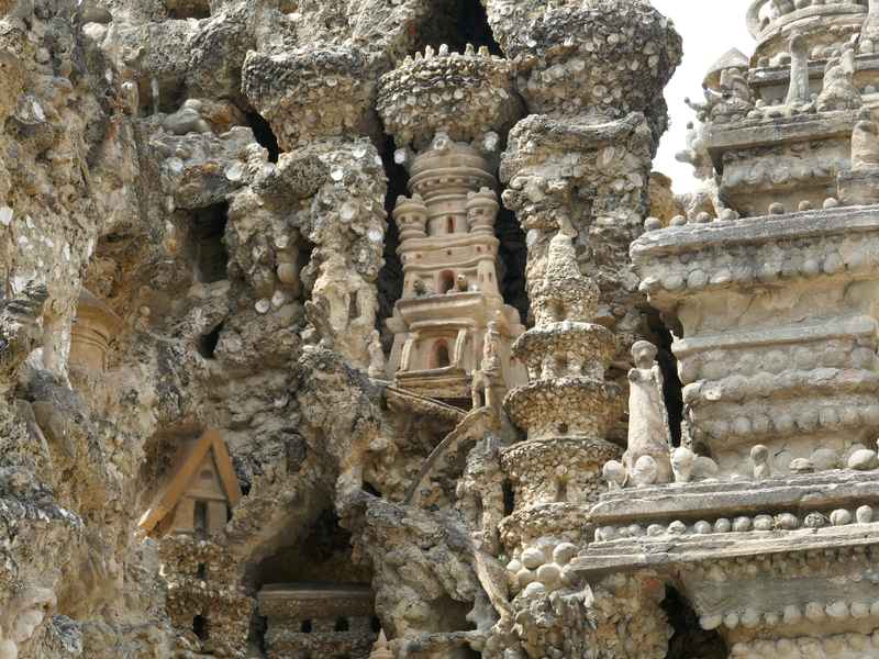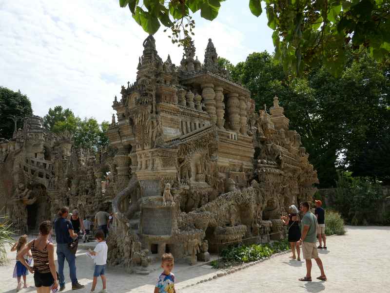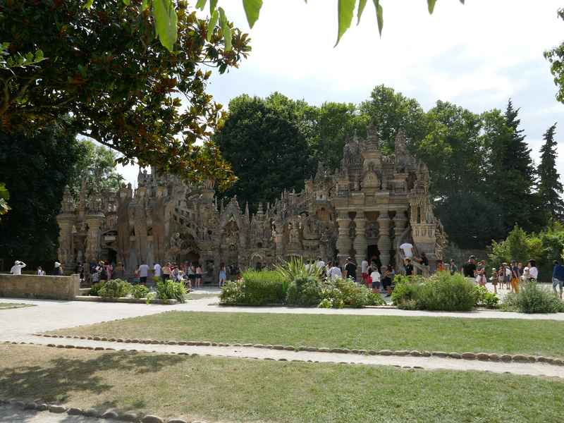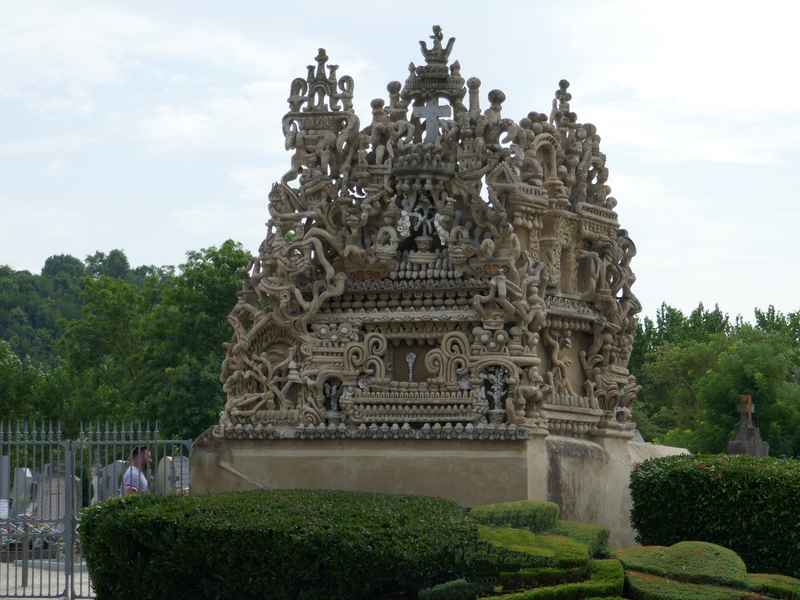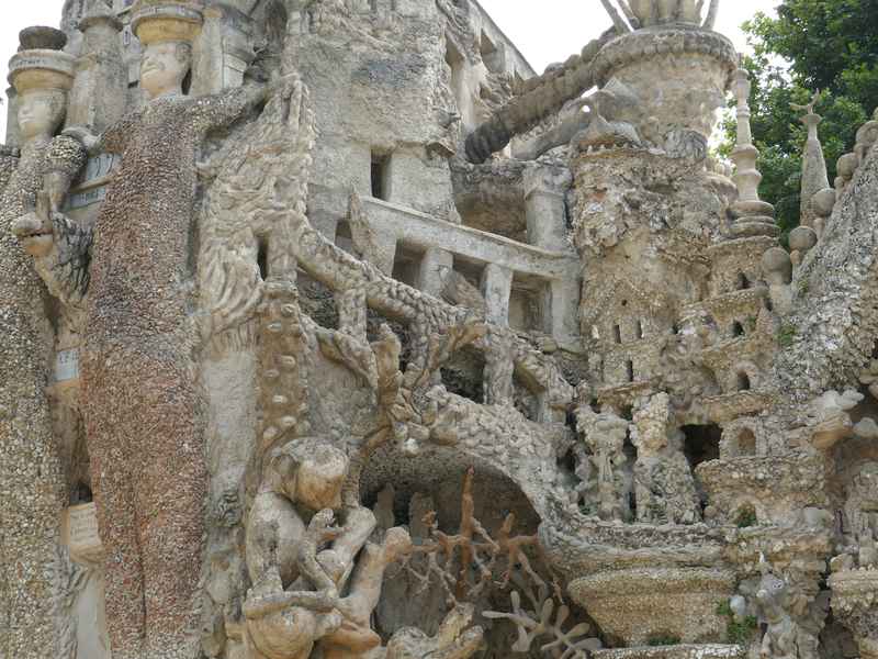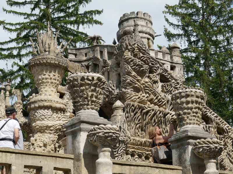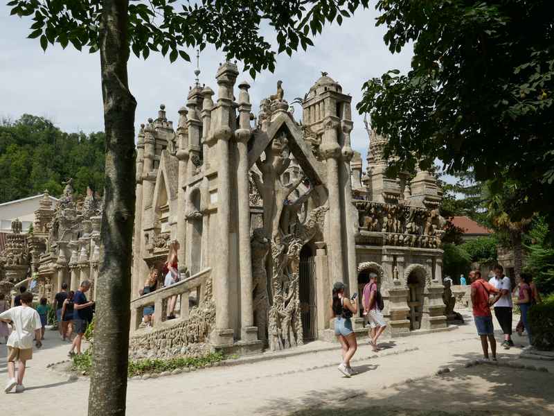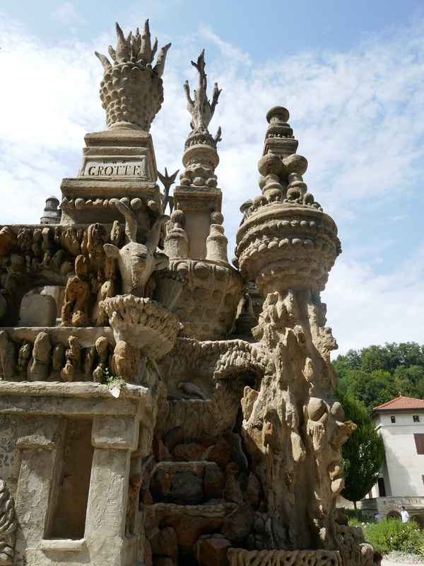 Nous décidons d’aller à Hauterives pour revoir Le Palais Idéal du Facteur Cheval construit par le facteur Ferdinand Cheval, de 1879 à 1912. Chef-d’œuvre de l’architecture naïve et de l’art naïf, il est classé au titre des monuments historiques depuis 1969. C’est aussi bien une évocation poétique de la nature qu’un mélange très personnel de différents styles architecturaux, avec des inspirations issues de la Bible et des mythologies hindoue et égyptienne. Il mesure 12 mètres de haut et 26 mètres de long, les différentes pièces, pierres et coquillages ramassés sur les chemins de la tournée postale, ont été assemblées avec de la chaux, du mortier, du ciment et des armatures métalliques; il est précurseur de la technique du béton armé. Cette période correspond au développement des voyages de nature touristique; la carte postale faisant son apparition en France en 1873, soit cinq ans avant le début du Palais Idéal. Celles-ci seront un support à son inspiration. Le Palais Idéal est achevé en 1912, lorsque le facteur atteint l’âge de 76 ans. Celui-ci construira également, avec les mêmes techniques, sa tombe au cimetière de Hauterives, le tombeau du silence et du repos sans fin, ainsi que la Villa Alicius, située à proximité du palais et tous classés au titre des monuments historiques.