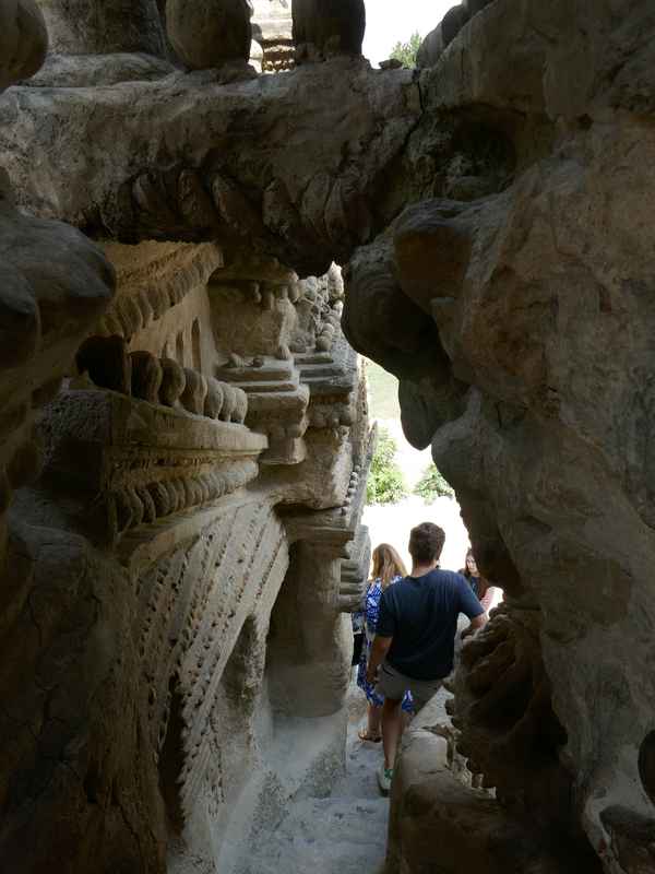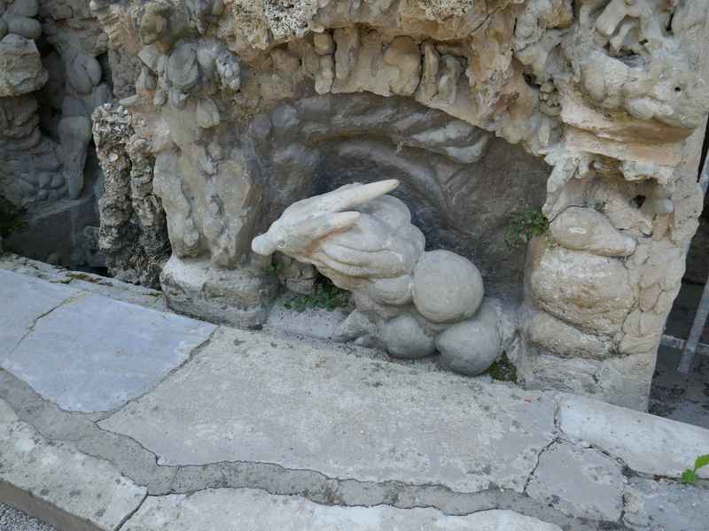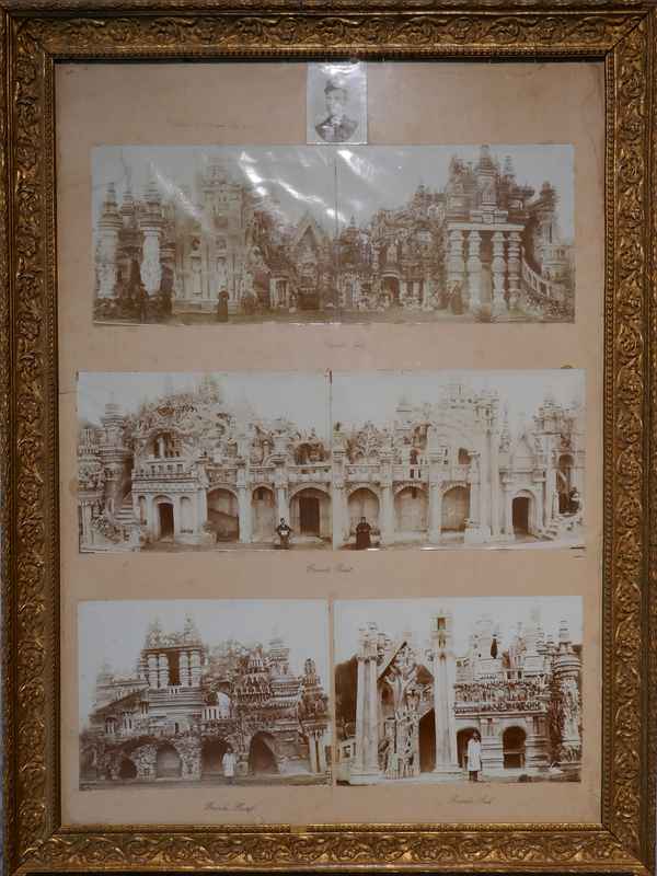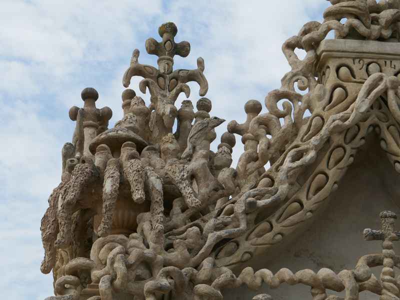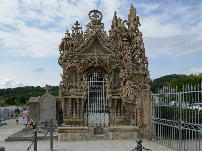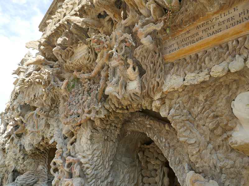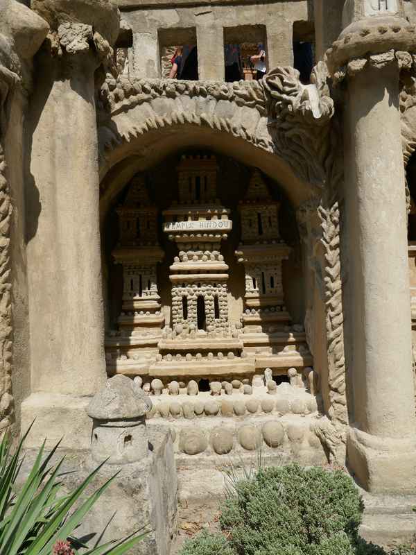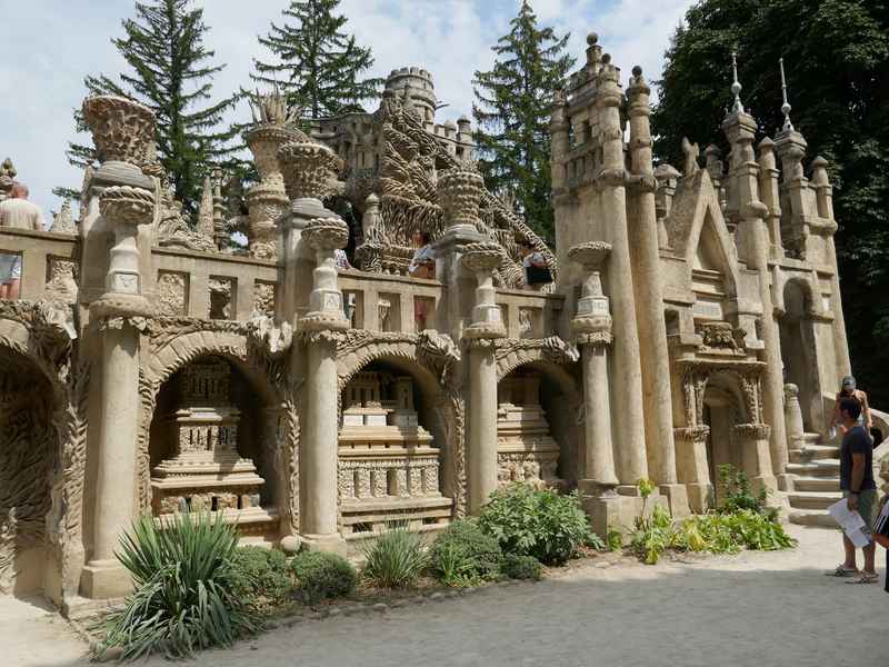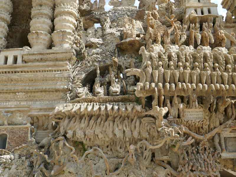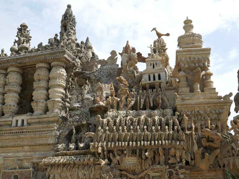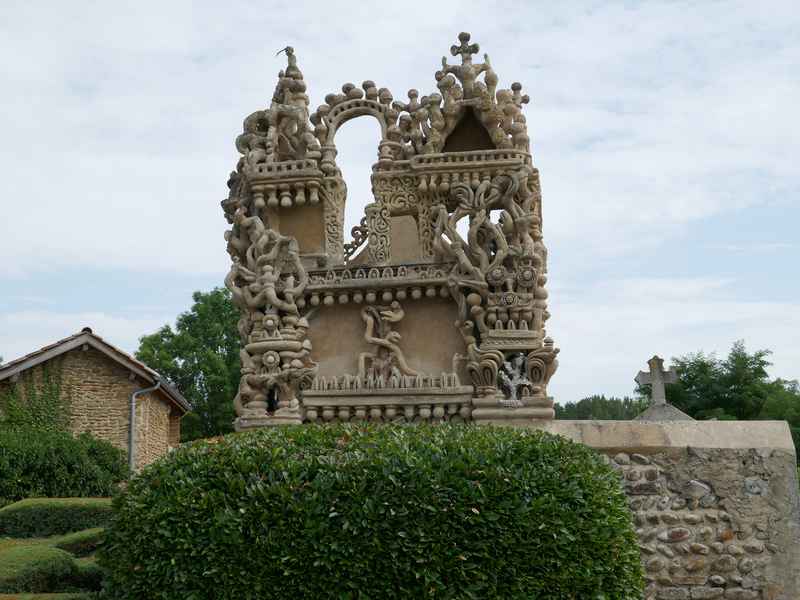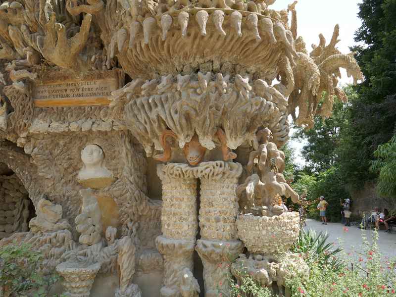 Nous décidons d’aller à Hauterives pour revoir Le Palais Idéal du Facteur Cheval construit par le facteur Ferdinand Cheval, de 1879 à 1912. Chef-d’œuvre de l’architecture naïve et de l’art naïf, il est classé au titre des monuments historiques depuis 1969. C’est aussi bien une évocation poétique de la nature qu’un mélange très personnel de différents styles architecturaux, avec des inspirations issues de la Bible et des mythologies hindoue et égyptienne. Il mesure 12 mètres de haut et 26 mètres de long, les différentes pièces, pierres et coquillages ramassés sur les chemins de la tournée postale, ont été assemblées avec de la chaux, du mortier, du ciment et des armatures métalliques; il est précurseur de la technique du béton armé. Cette période correspond au développement des voyages de nature touristique; la carte postale faisant son apparition en France en 1873, soit cinq ans avant le début du Palais Idéal. Celles-ci seront un support à son inspiration. Le Palais Idéal est achevé en 1912, lorsque le facteur atteint l’âge de 76 ans. Celui-ci construira également, avec les mêmes techniques, sa tombe au cimetière de Hauterives, le tombeau du silence et du repos sans fin, ainsi que la Villa Alicius, située à proximité du palais et tous classés au titre des monuments historiques.